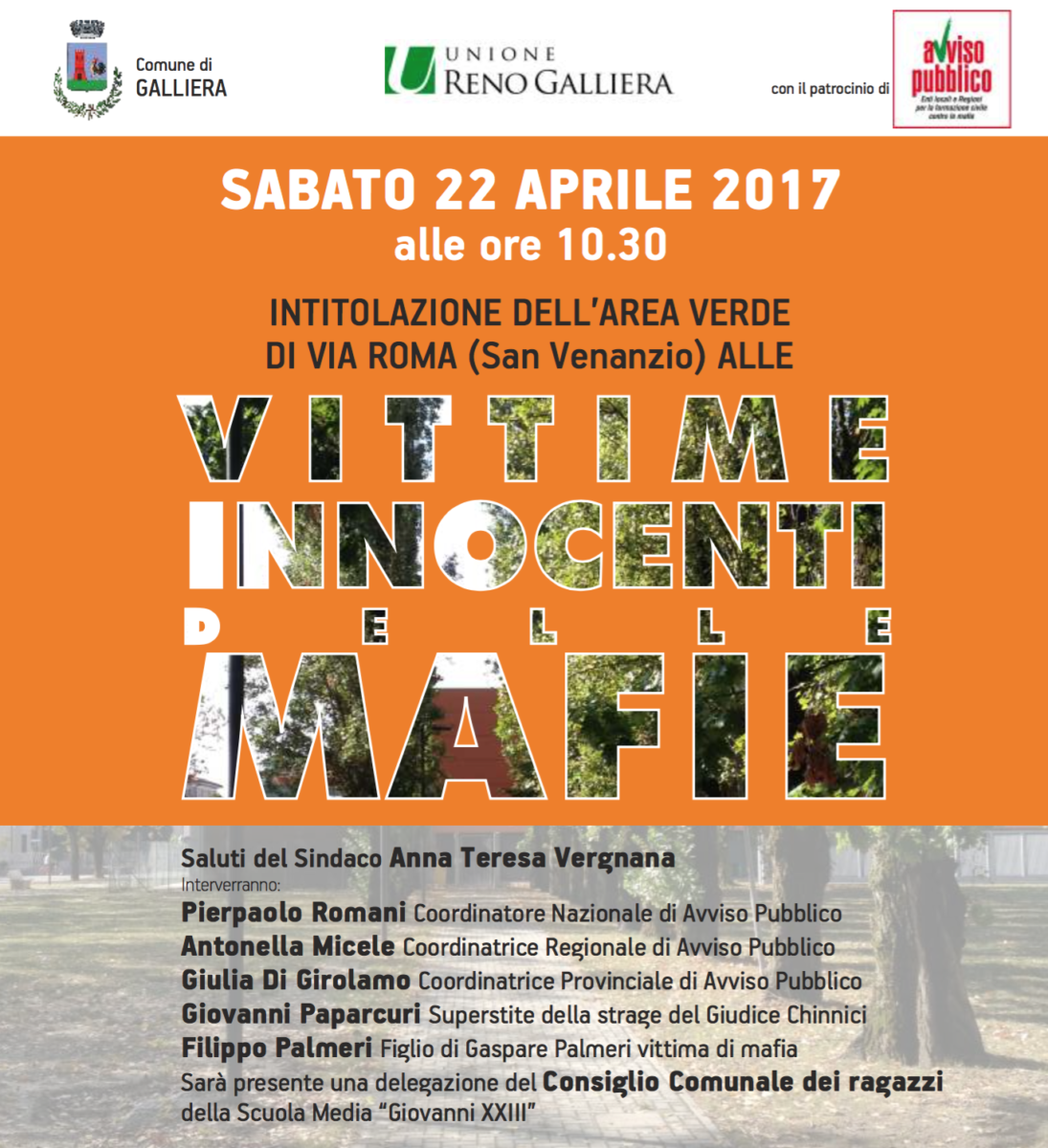 Sabato 22 aprile, a Galliera, alle ore 10,30 l’amministrazione comunale intitolerà l’area verde di via Roma alle Vittime innocenti di tutte le mafie.