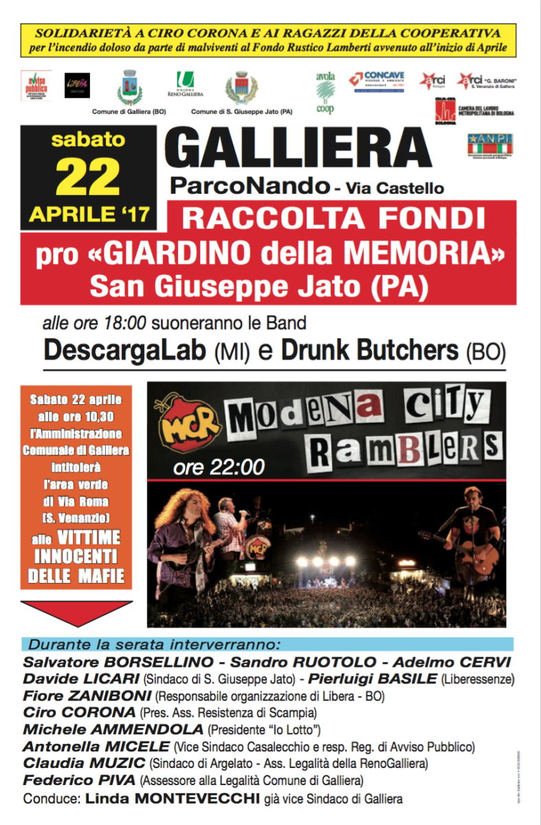 Nel pomeriggio alle ore 18, presso il Parco Nando, in via Castello, si svolgerà invece una iniziativa di raccolta fondi per il “Giardino della memoria” di San Giuseppe Jato (PA).  Suoneranno le Band DescargaLab (MI) e Drunk Butchers (BO). Durante la serata interverranno: