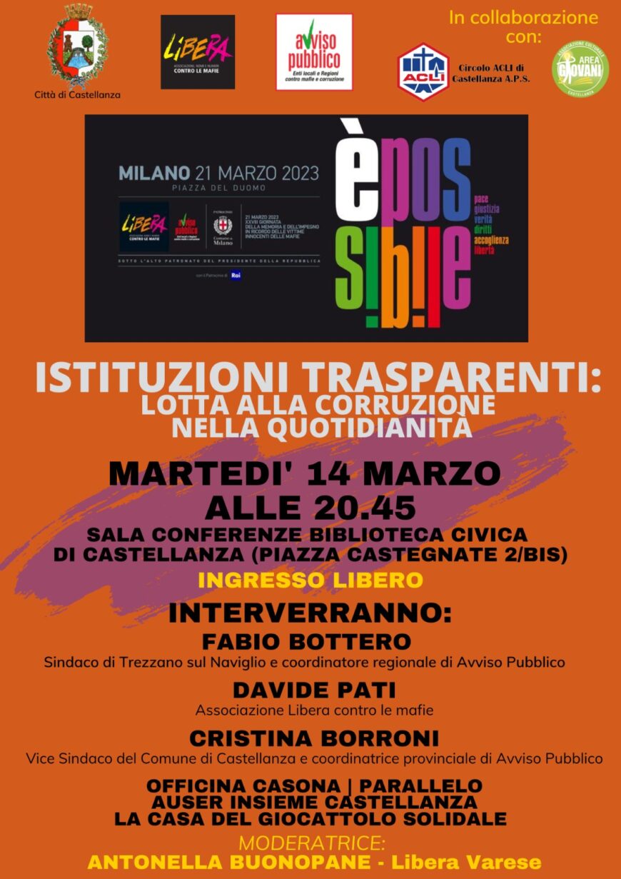 Il Comune di Castellanza, in vista della XXVIII Giornata della Memoria e dell’Impegno in ricordo delle vittime innocenti delle mafie che si svolgerà a Milano il 21 marzo, organizza per martedì 14 marzo alle 20.45, presso la Sala delle Conferenze della Biblioteca civica, l’incontro “Istituzioni trasparenti: lotta alla corruzione nella quotidianità”.