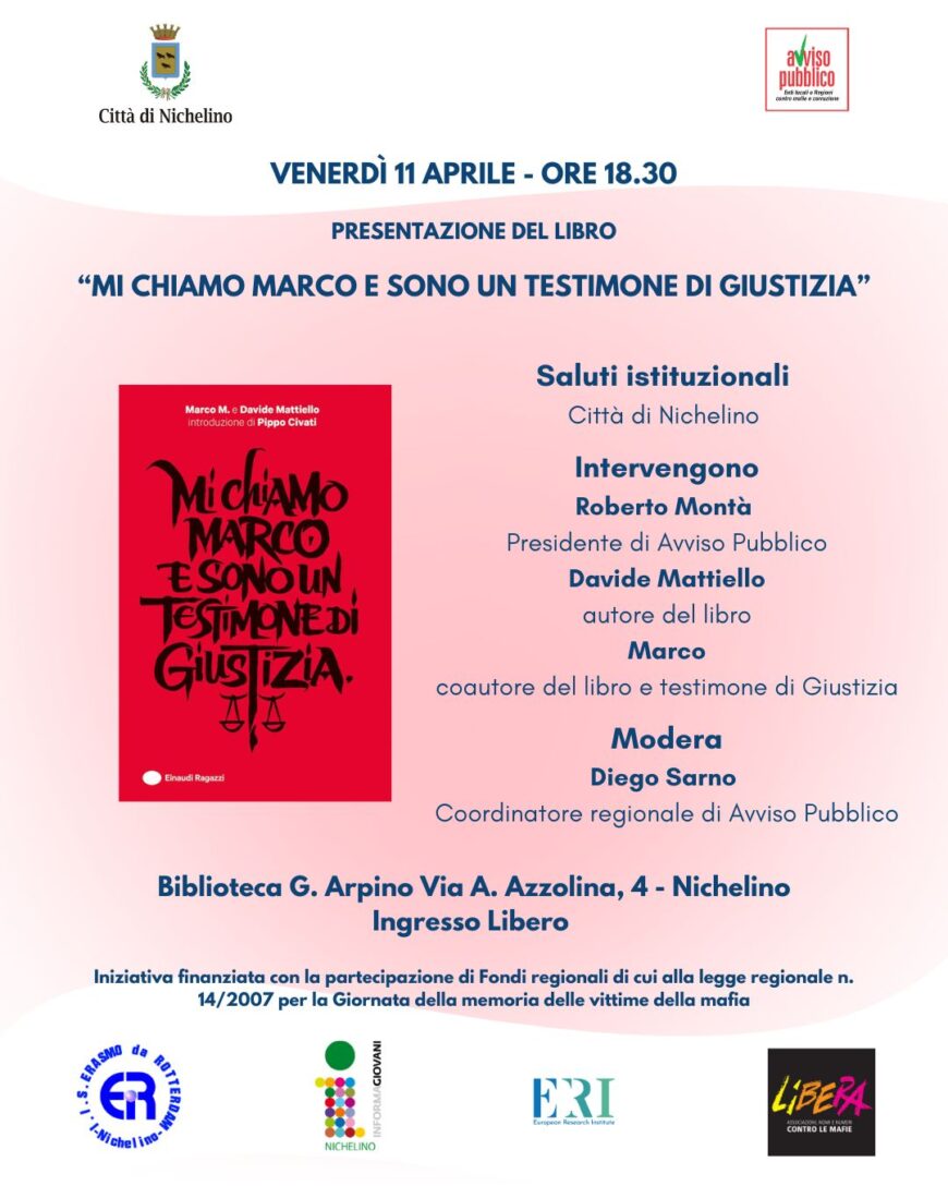 Il Comune di Nichelino, in collaborazione con Avviso Pubblico, promuove la presentazione del libro “Mi chiamo Marco e sono un testimone di giustizia” (Einaudi ragazzi, 2025) di Davide Mattiello. L’iniziativa è finanziata con la partecipazione di Fondi regionali di cui alla legge regionale n. 14/2007 per la Giornata della memoria delle vittime della mafia.