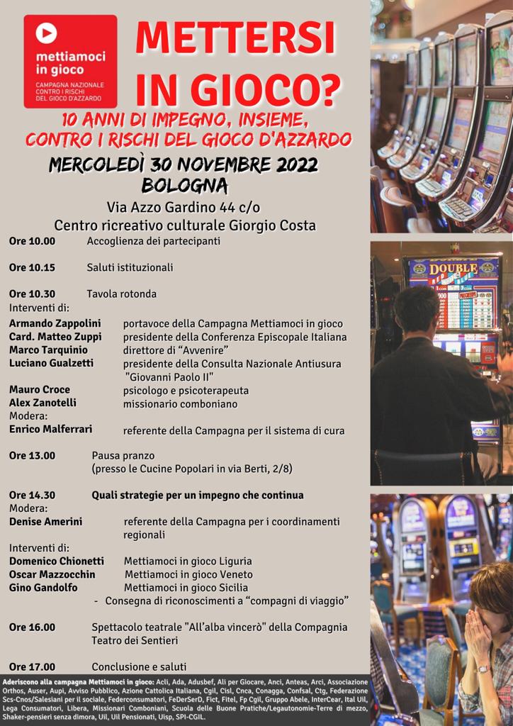 L’evento dal titolo “Mettersi in gioco? 10 anni di impegno, insieme, contro i rischi del gioco d’azzardo” è previsto per mercoledì 30 novembre a Bologna, a partire dalle ore 10:00, presso il Centro ricreativo culturale Giorgio Costa, in via Azzo Giardino 44.