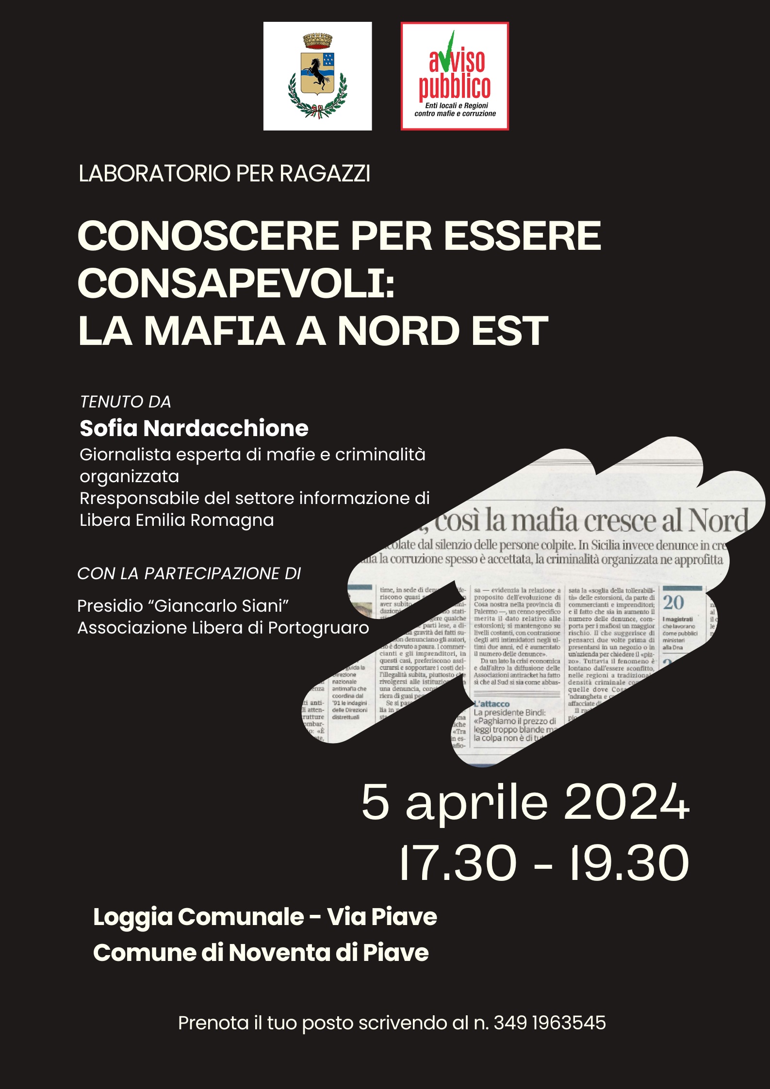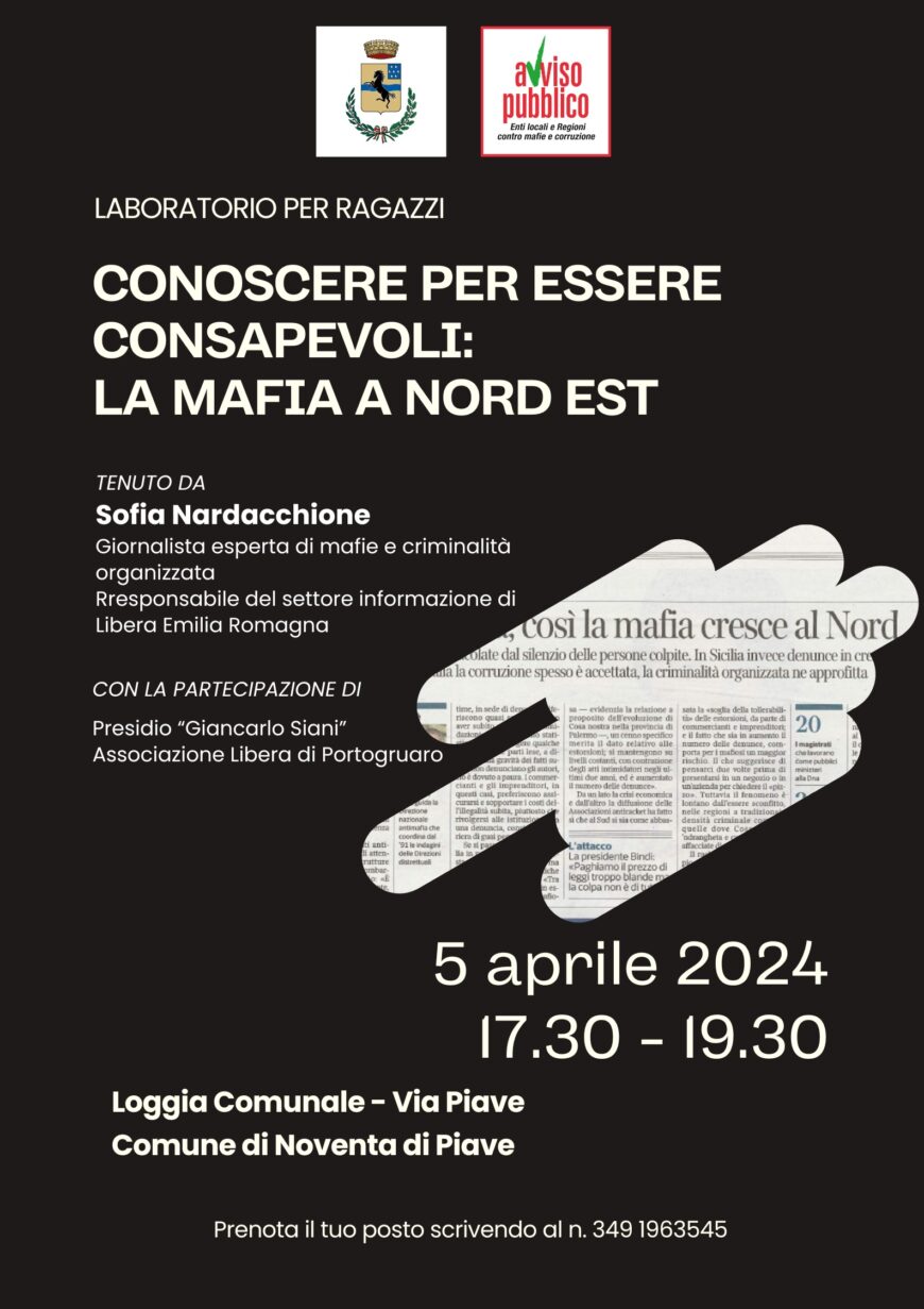 L’appuntamento è venerdì 5 aprile dalle 17.30 alle 19.30, presso la Loggia Comunale, in Via Piave a Noventa di Piave. L’evento è organizzato dall’amministrazione comunale di Noventa di Piave ed è patrocinato da Avviso Pubblico.