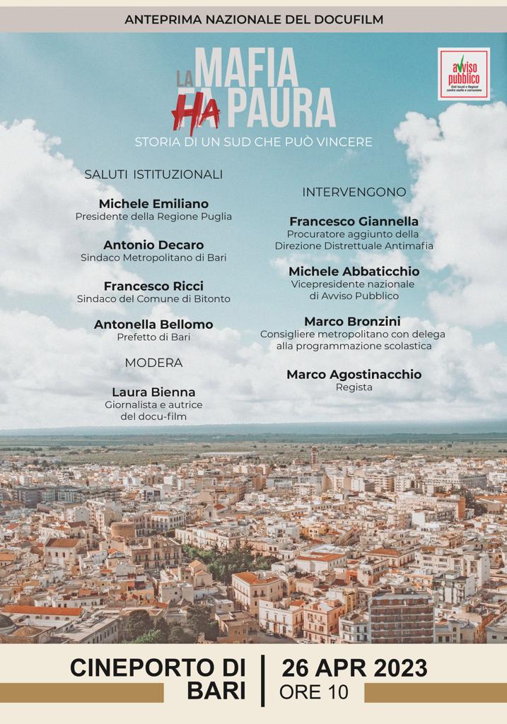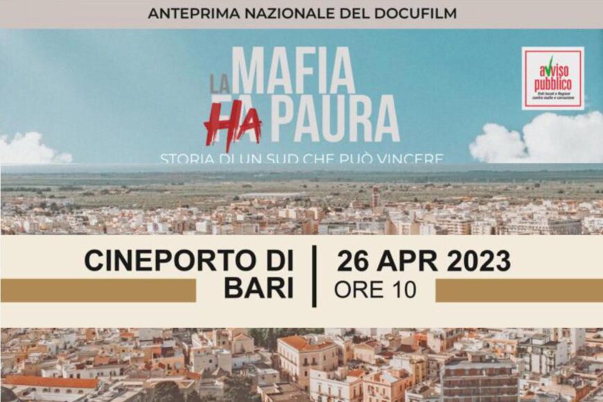 “LA MAFIA HA PAURA”: IL 26 APRILE A BARI LA PRIMA PROIEZIONE DEL DOCUFILM DI AVVISO PUBBLICO SULLA STORIA DI UN SUD CHE PUÒ VINCERE