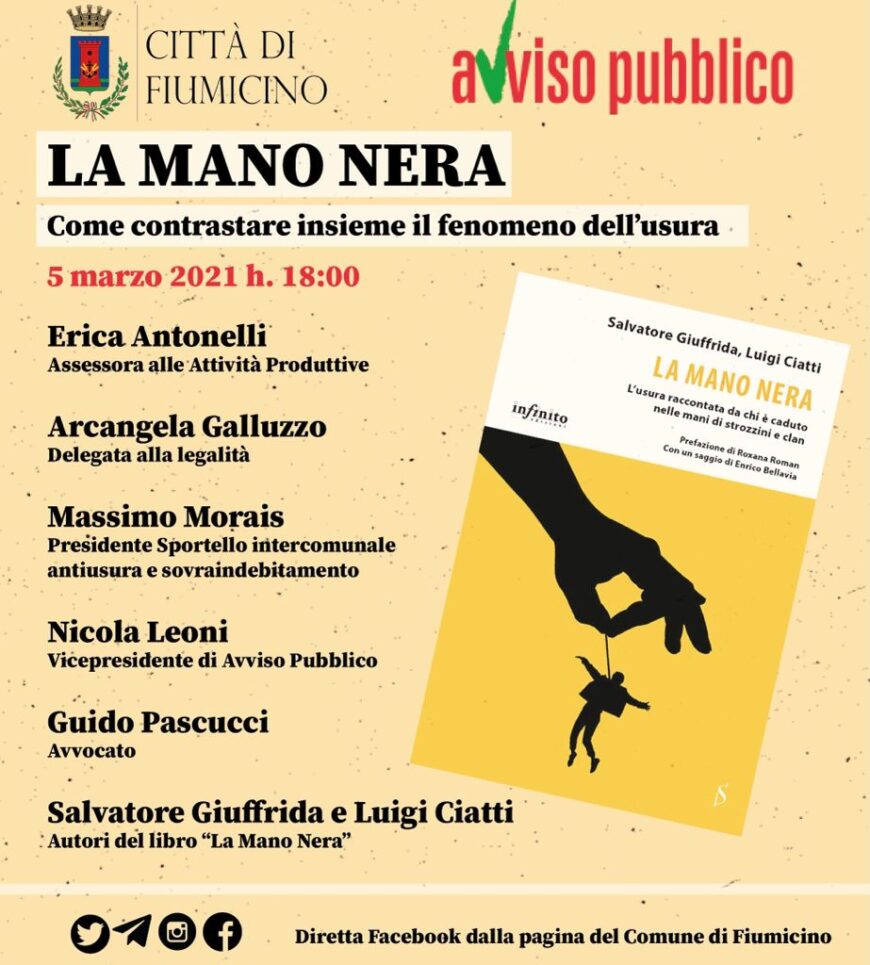 Venerdì 5 marzo, alle ore 18.00, in diretta sulla pagina Facebook del Comune di Fiumicino, Avviso Pubblico parteciperà alla presentazione del libro “La mano nera. L’usura raccontata da chi è caduto nelle mani di strozzini e clan” di Salvatore Giuffrida e Luigi Ciatti.