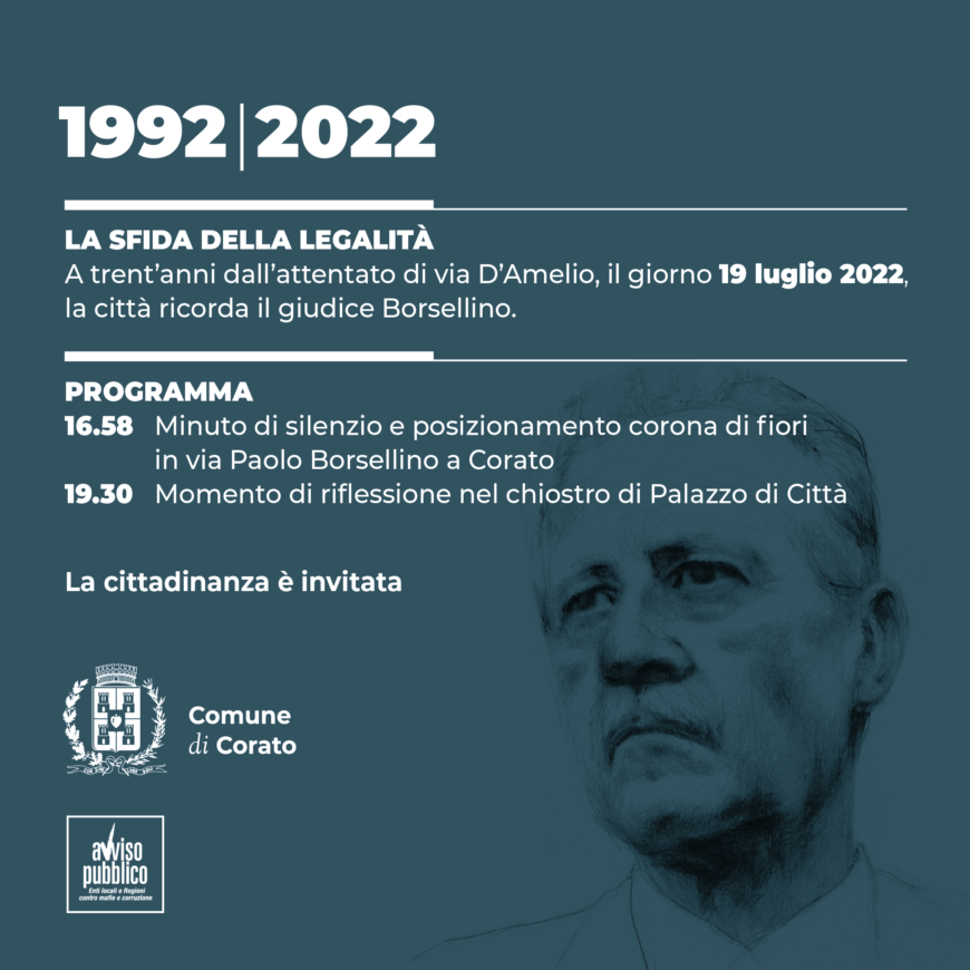 A trent’anni dall’attentato stragista di via D’Amelio, il comune di Corato ha deciso di ricordare il giudice Paolo Borsellino e gli agenti della scorta uccisi dalla bomba di mafia. L’evento, previsto per martedì 19 luglio, è patrocinato da Avviso Pubblico.