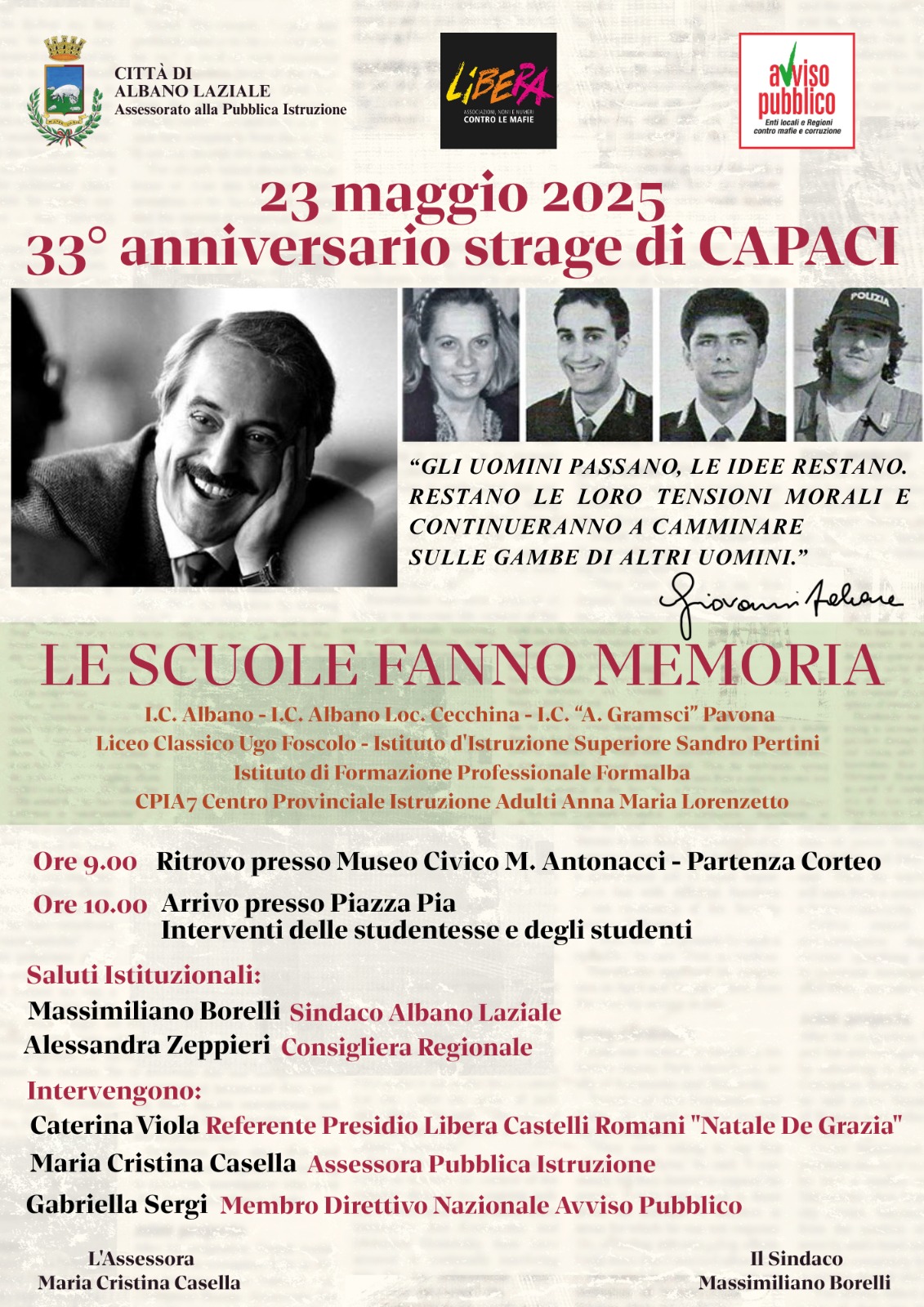 Il 23 maggio 2025, dalle 09:00 alle 10:30, il Comune di Albano Laziale organizza l’evento “Le scuole fanno memoria”, per la commemorazione del 33° anniversario della strage di Capaci.