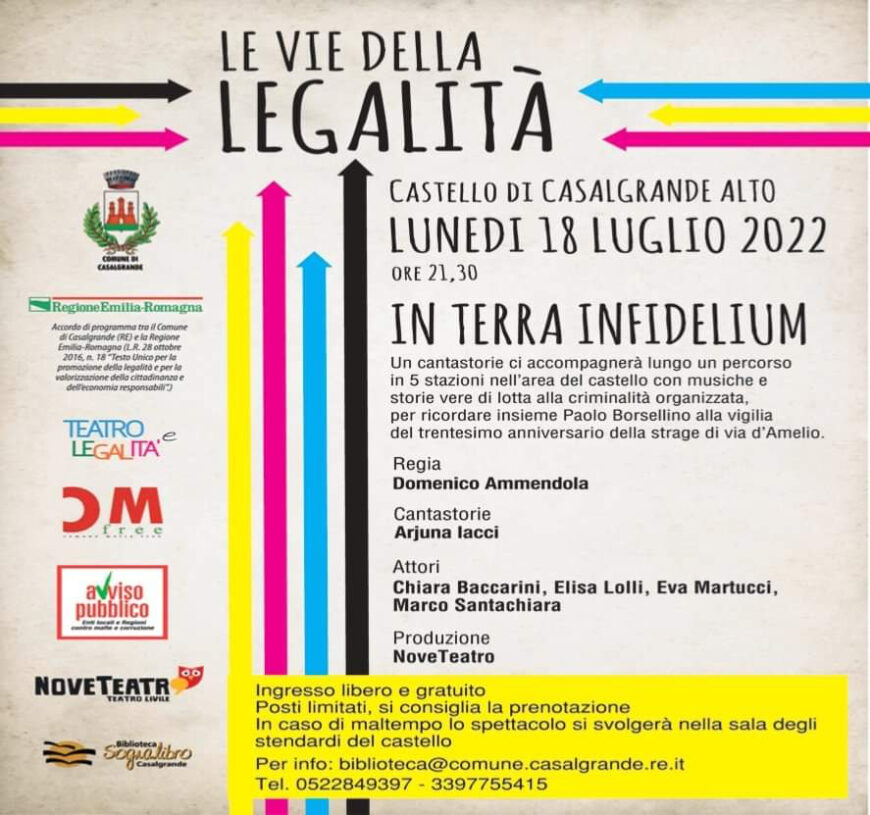 L’evento è organizzato dal Comune di Casalgrande, col patrocinio della Regione Emilia Romagna, l’associazione “Teatro e Legalità”, il gruppo “CMfree”, NoveTeatro, la biblioteca “Lo sfoglialibro” e Avviso Pubblico.