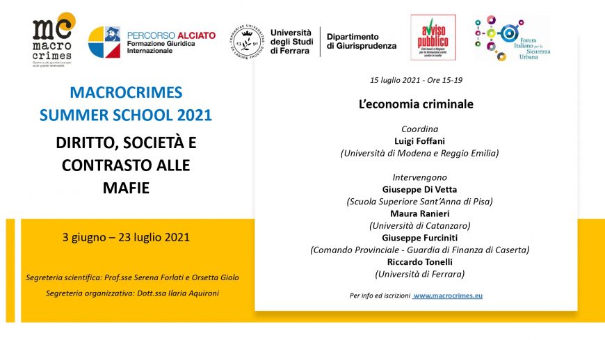 Giovedì 15 luglio, alle ore 15.00, in videoconferenza, verrà trasmesso il sesto seminario della Summer School “Diritto, società e contrasto alle mafie” promosso da Microcrimes (Centro studi giuridici europei sulla grande criminalità), in collaborazione anche con Avviso Pubblico.