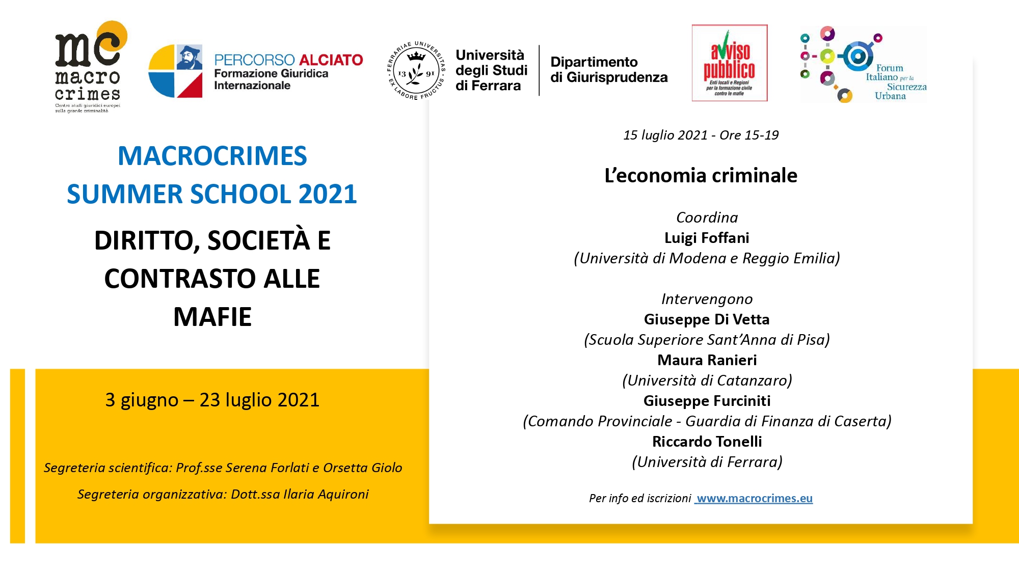 L’incontro, dal titolo “L’economia criminale” sarà coordinato da Luigi Foffani dell’Università di Modena e Reggio Emilia e vedrà come relatori: