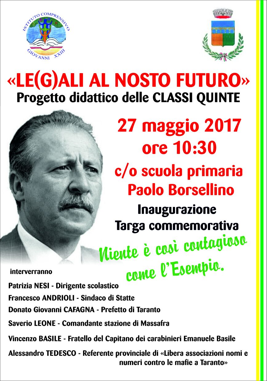 Alle ore 10.30 presso la Scuola Primaria Paolo Borsellino si terrà l’inaugurazione della targa commemorativa dedicata al Giudice Paolo Borsellino. A seguire un dibattito sulla legalità a cura degli alunni delle classi quinte coordinati dalla maestra Provvidenza Accardi, Responsabile Progetto Legalità Scuola Primaria.