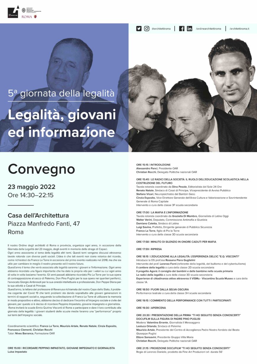 L’Ordine degli architetti di Roma e provincia, organizza per lunedì 23 maggio a partire dalle ore 15.00 il convegno “Legalità giovani e informazione”, presso la Casa dell’Architettura in Piazza Manfredo Fanti 47 a Roma, in occasione della Giornata della Legalità del 23 maggio, in memoria della strage di Capaci. Per Avviso Pubblico partecipa il vicepresidente Renato Natale, sindaco di Casal di Principe.
