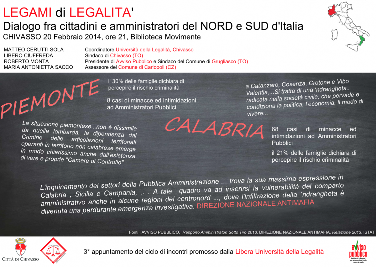 Venerdì 20 febbraio 2015, a Chivasso (TO), alle ore 21, presso la Biblioteca Movimente, si terrà il terzo appuntamento del ciclo di incontri promosso dalla Libera Università della Legalità, con la collaborazione anche di Avviso Pubblico, dal titolo Legami Di Legalità, “Dialogo fra Cittadini E Amministratori Del Nord E Sud d’Italia”.