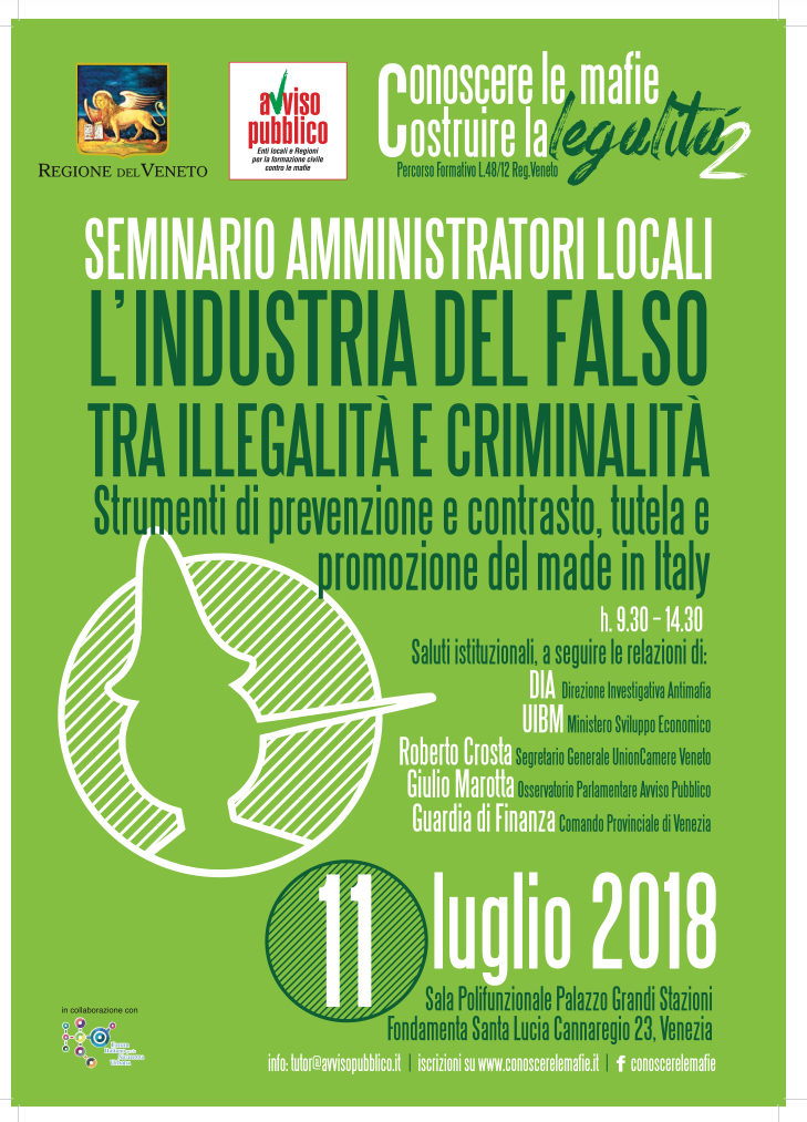 Mercoledì 11 luglio, a Venezia, presso la Sala Polifunzionale Palazzo Grandi Stazioni, Regione Veneto (Fondamenta Santa Lucia Cannaregio, 23), dalle ore 9,30 alle ore 14,30 si svolgerà il Seminario di formazione dal titolo “L’industria del falso tra illegalità e criminalità. Strumenti di prevenzione e contrasto, tutela e promozione del made in Italy” promosso dalla Regione del Veneto, in collaborazione con Avviso Pubblico, nell’ambito del progetto “Conoscere le mafie, costruire la legalità 2”.