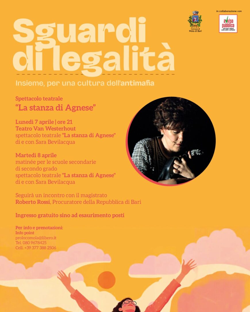 Sarà lo spettacolo teatrale “La stanza di Agnese” di e con Sara Bevilacqua a chiudere il meraviglioso percorso della rassegna culturale “Sguardi di legalità – Insieme, per una cultura dell’antimafia”, ideata dal Comune di Mola di Bari in collaborazione con Avviso Pubblico, iniziata lo scorso 7 marzo e passata per incontri nelle scuole, presentazioni di libri, approfondimenti cinematografici e per il meeting con le istituzioni e con Dario Vassallo, fratello del sindaco pescatore.