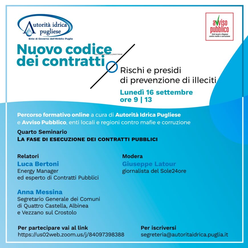Il 16 settembre dalle ore 9 alle 13, con il seminario online dal titolo “La fase di esecuzione dei contratti pubblici” si conclude il programma formativo “La gestione dei contratti pubblici e il monitoraggio dei progetti PNRR”.