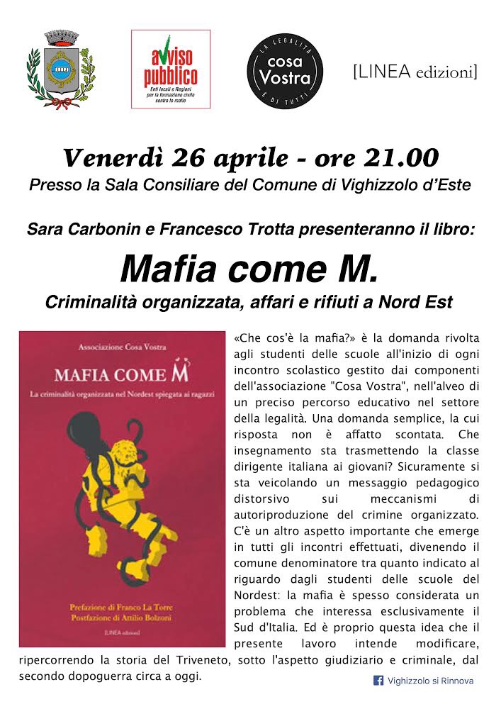 Venerdì 26 aprile alle ore 21.00, presso la Sala consiliare del Comune di Vighizzolo d’Este (Pd), si terrà la presentazione di “Mafia come M. – Criminalità organizzata, affari e rifiuti a Nord Est”, il libro divulgativo curato da Francesco Trotta per l’Associazione Cosa Vostra (Linea Edizioni).