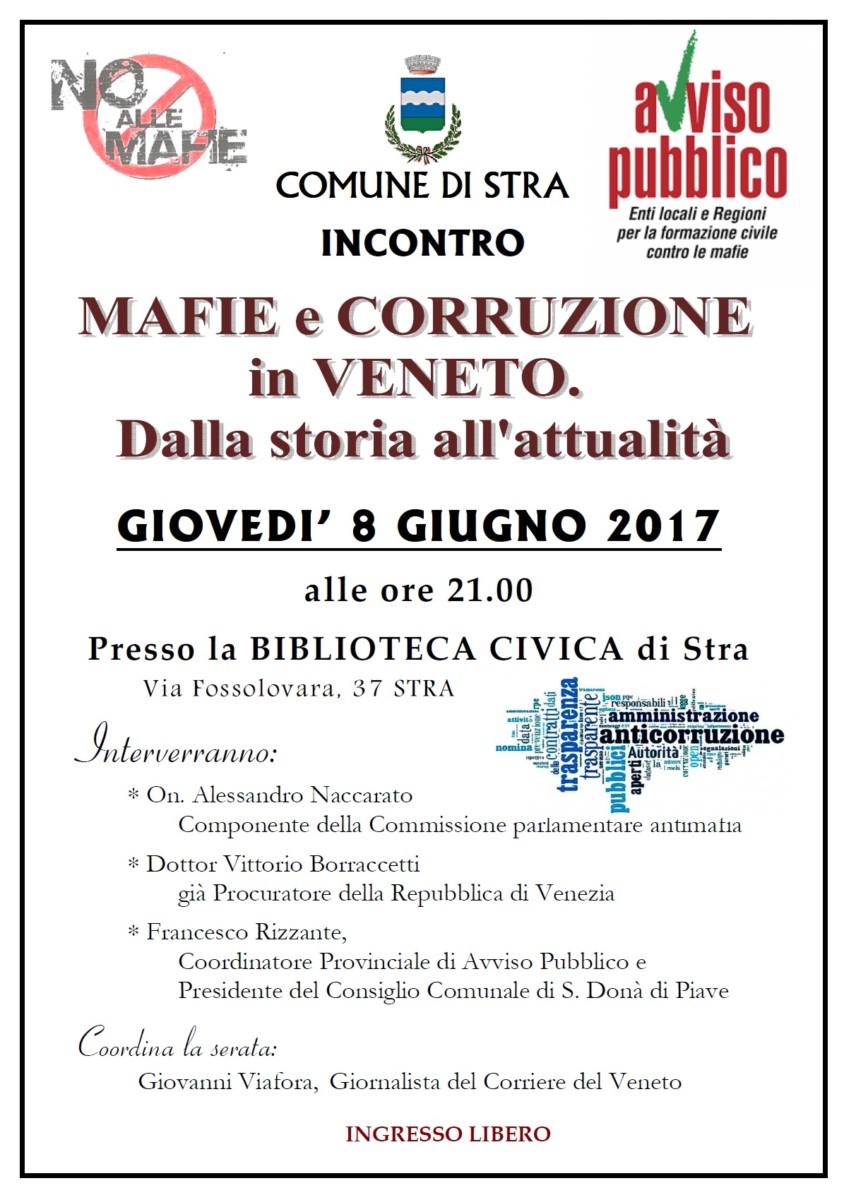 Giovedì 8 giugno 2017, alle ore 21, presso la Biblioteca Civica di Stra (provincia di Venezia) in via Fossolovara, 37, si svolgerà l’iniziativa ‘Mafie e corruzione in Veneto. Dalla storia all’attualità’, organizzata dal Comune in collaborazione anche con Avviso Pubblico.