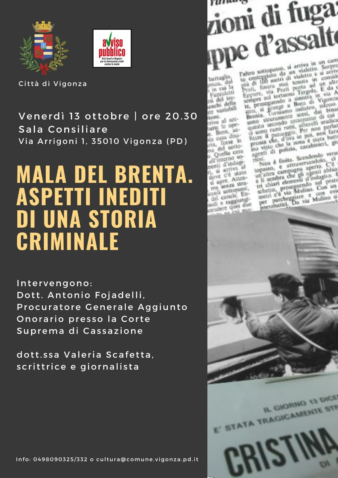 L’appuntamento è è per venerdì 13 ottobre alle 20.30, presso la Sala consigliare di Vigonza (Padova), in via Arrigoni 1 con l’incontro “Mala del Brenta. Aspetti inediti di una storia criminale”.