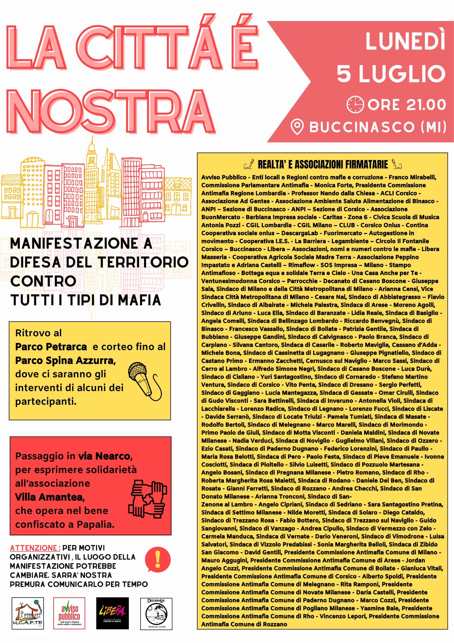Alla manifestazione, realizzata con il patrocinio del Comune di Buccinasco, le associazioni Una Casa Anche per Te, Avviso Pubblico, Libera e Descargalab, saranno presenti oltre quaranta rappresentanti dei Comuni firmatari del comunicato stampa di condanna e di sostegno ai cittadini di Buccinasco e al Sindaco Rino Pruiti, sottoscritto da oltre 100 realtà tra associazioni, parrocchie e Sindaci della Città Metropolitana di Milano.