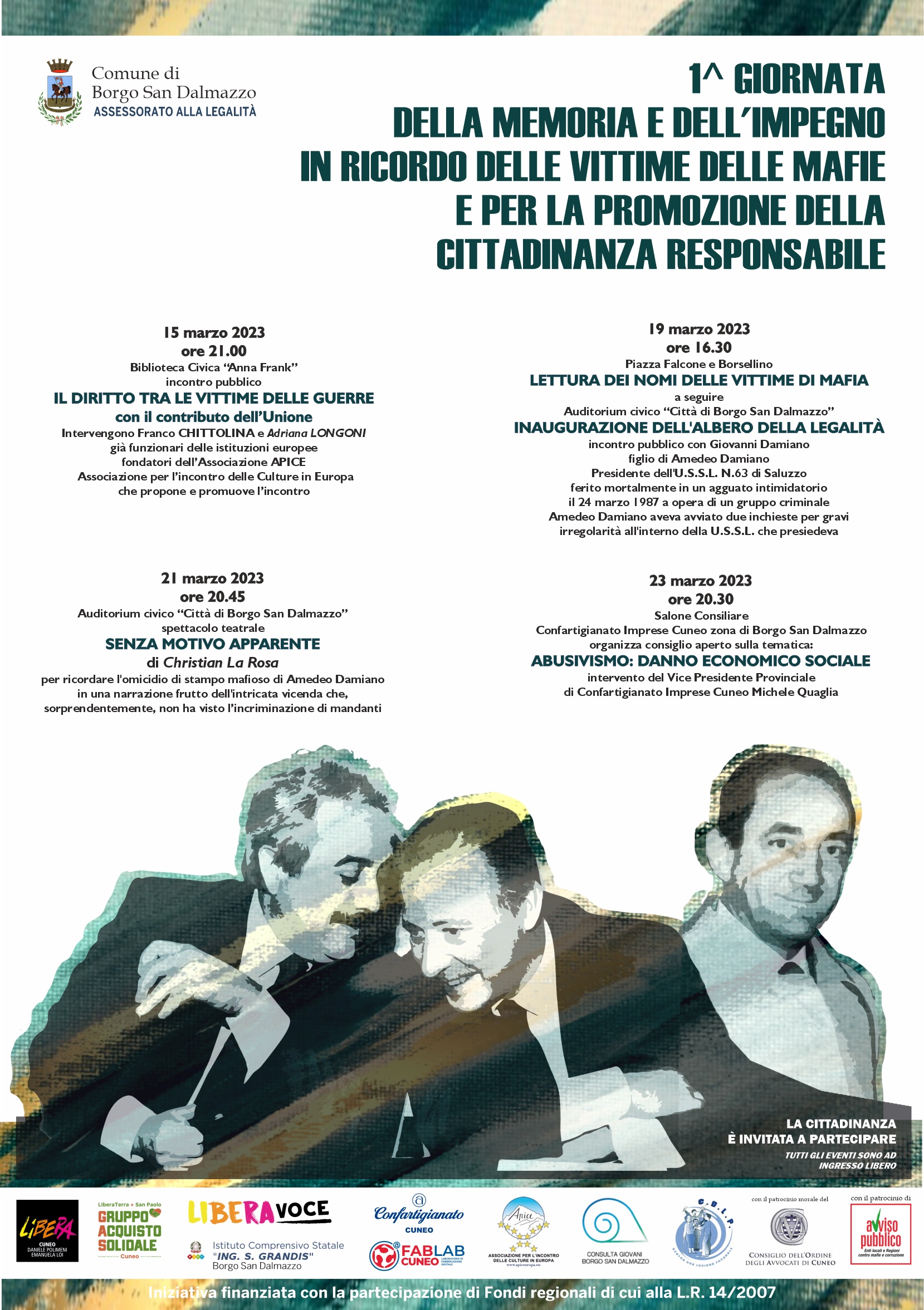 In vista della 28° Giornata della Memoria e dell’Impegno in ricordo delle vittime innocenti delle mafie che si terrà a Milano, il Comune di Borgo San Dalmazzo (Cuneo), ha organizzato una serie di eventi dal 15 al 23 marzo. Gli incontri sono patrocinati da Avviso Pubblico e Libera.