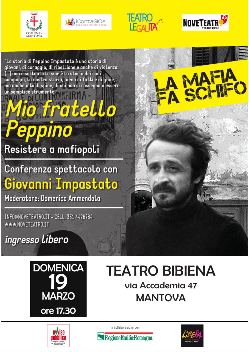 Domenica 19 marzo, alle ore 17.30, si svolgerà al teatro Bibiena di Mantova (via Accademia 47) la conferenza spettacolo ‘Mio fratello Peppino. Resistere a Mafiopoli’, con Giovanni Impastato.