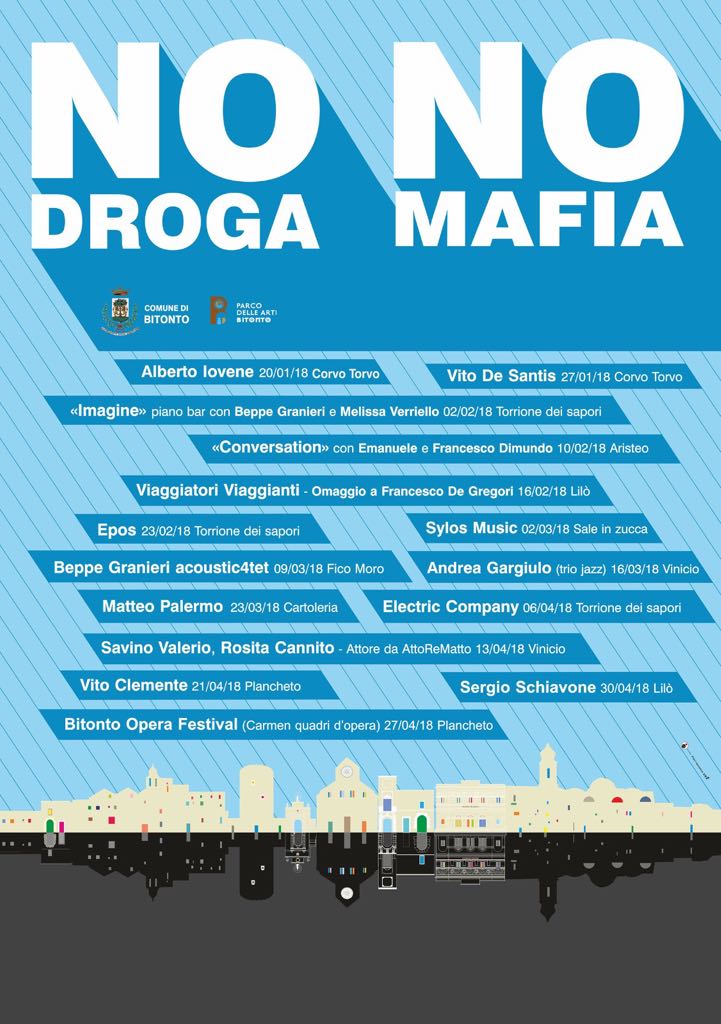 Si terrà a Bitonto (Ba), dal prossimo 20 gennaio fino al 1°maggio, la rassegna “No droga, no mafia”, una serie di concerti itineranti nei principali locali della città vecchia, per sensibilizzare i più giovani sul consumo degli stupefacenti, principale canale di finanziamento delle organizzazioni criminali.