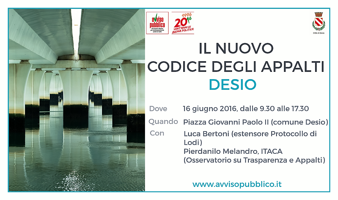 Si svolgerà giovedì 16 giugno, dalle ore 9.00 alle ore 18.00 a presso la sede del Comune di Desio (Piazza Giovanni Paolo II), la giornata di formazione sul tema del “nuovo Codice degli Appalti”, voluta dal Comune di Desio in collaborazione con Avviso Pubblico.