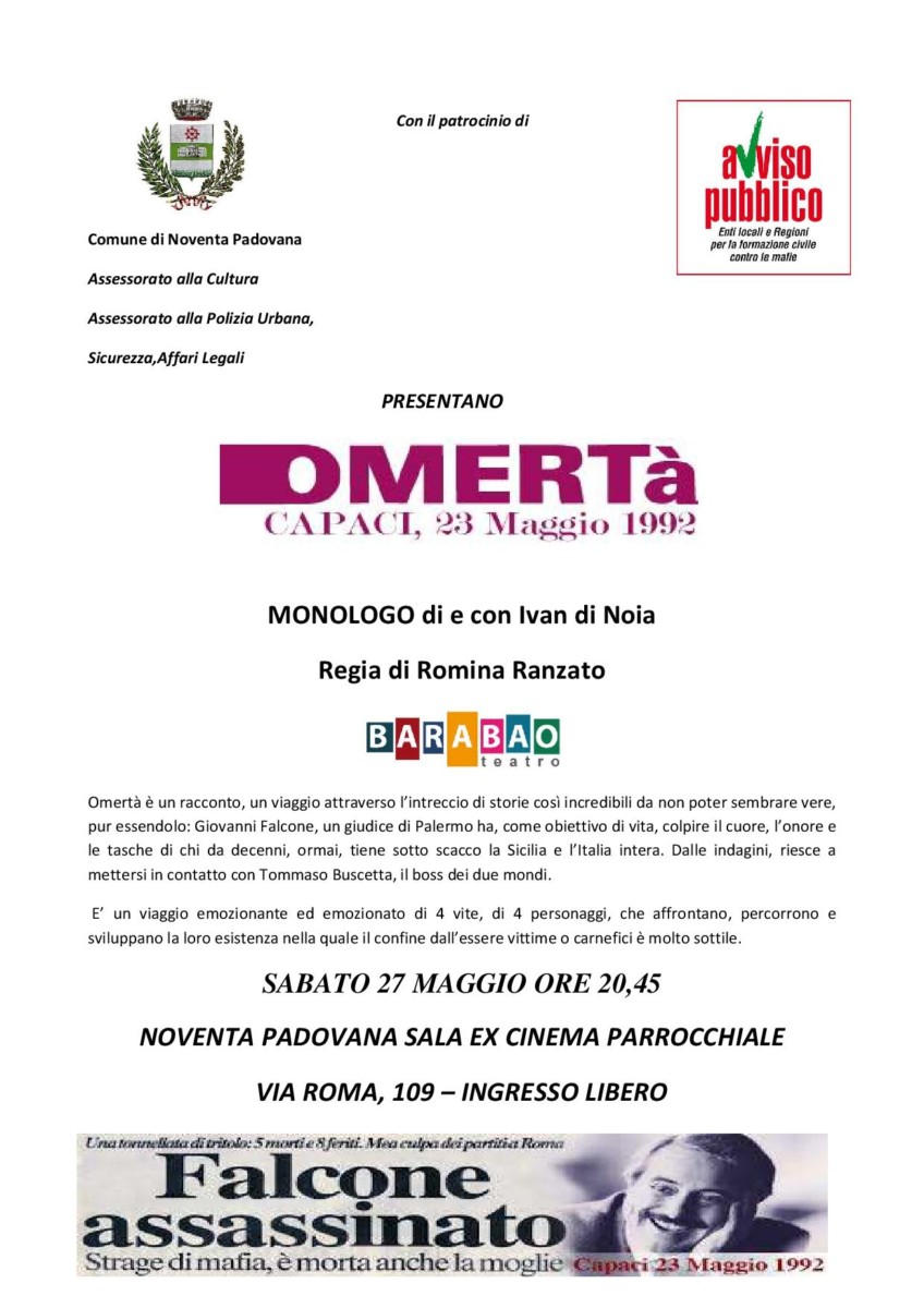 Sabato 27 maggio, alle ore 20,45, a Noventa Padovana, presso la Sala Ex Cinema parrocchiale, in via Roma 109, si svolgerà l’iniziativa ‘Omertà. Capaci, 23 maggio 1992’ Monologo di e con Ivan di Noia, regia di Romina Ranzato.