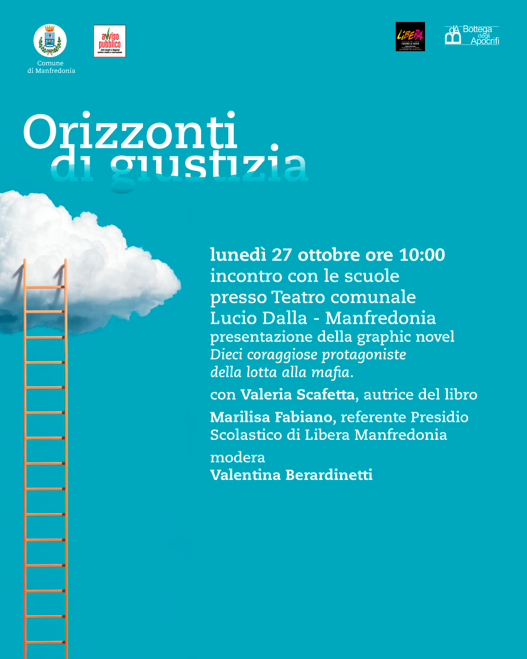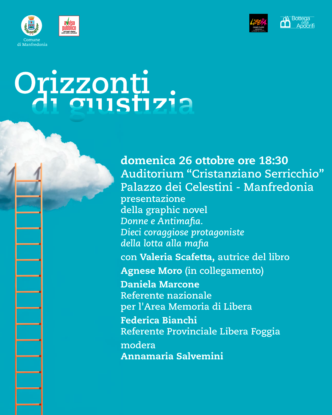 Nell’ambito della rassegna “Orizzonti di giustizia”, promossa dal Comune di Manfredonia, in collaborazione con Avviso Pubblico, Libera. Associazioni, nomi e numeri contro le mafie e la Bottega degli Apocrifi, si terrà l’incontro pubblico “Donne e Antimafia”.