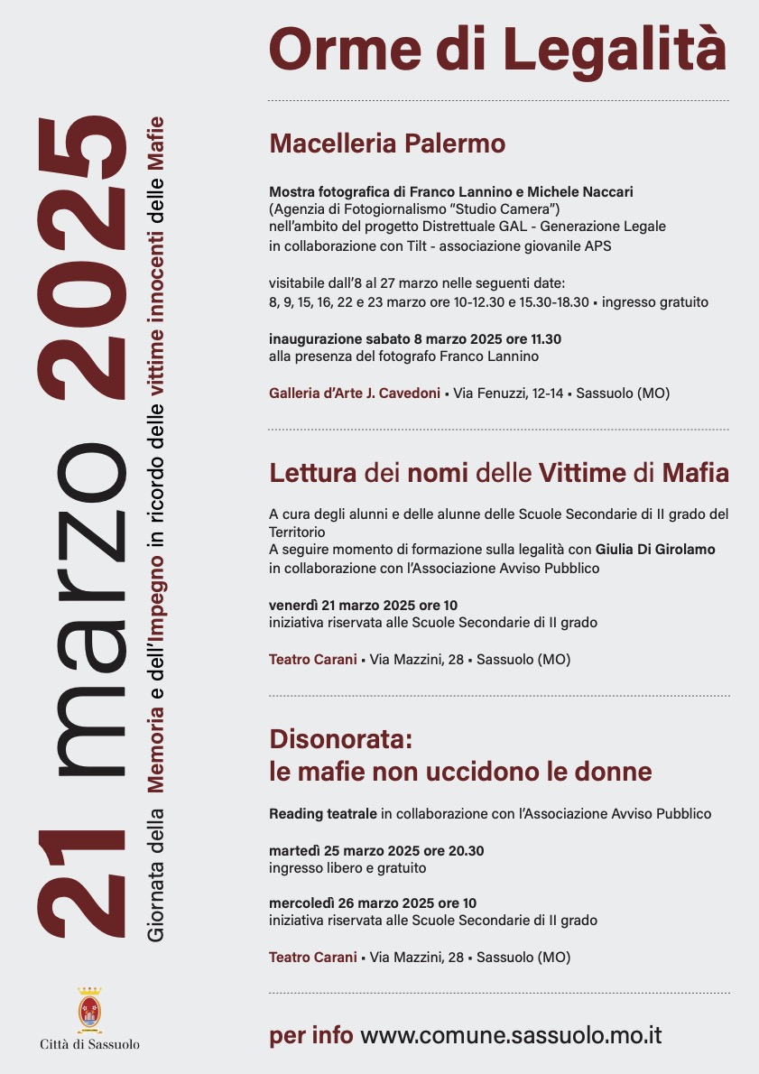“Orme di Legalità”. È questo il titolo della Rassegna, ideata dal Comune di Sassuolo e realizzata in collaborazione con Avviso Pubblico, che si svolgerà dal 21 al 25 marzo.