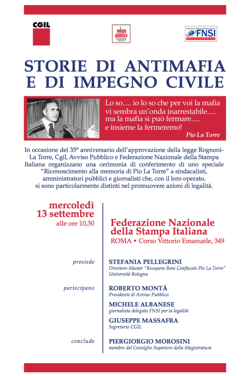 Si svolgerà mercoledì 13 settembre a Roma, alle ore 10,30, presso la sede della FNSI (corso Vittorio Emanuele II, 349) l’iniziativa ‘Pio la Torre per i diritti’, promossa da Cgil, Avviso Pubblico e Federazione Nazionale della Stampa.