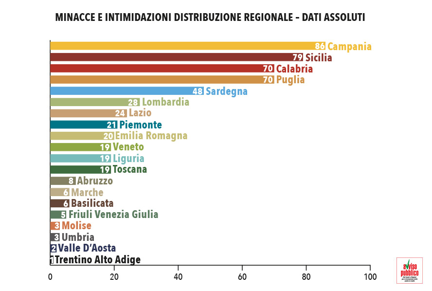La situazione regionale: in Campania il maggior numero di intimidazioni. Il primato della Lombardia nel Centro-Nord