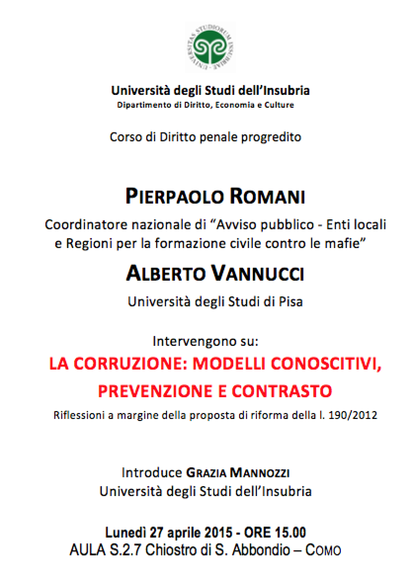 Lunedì 27 aprile, alle ore 15.00, a Como, presso c/o aula S.2.7 del Chiostro di S. Abbondio, il Coordinatore nazionale di Avviso Pubblico, Pierpaolo Romani insieme al Prof. Alberto Vannucci, membro della Commissione consultiva permanente di Avviso Pubblico incontreranno gli studenti del corso di Diritto Penale dell’Università dell’Insubria.