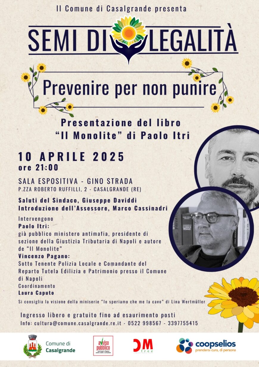 Il Comune di Casalgrande in provincia di Reggio Emilia, organizza l’evento “Prevenire per non punire”, durante il quale Paolo Itri presenterà il suo libro “Il Monolite”.