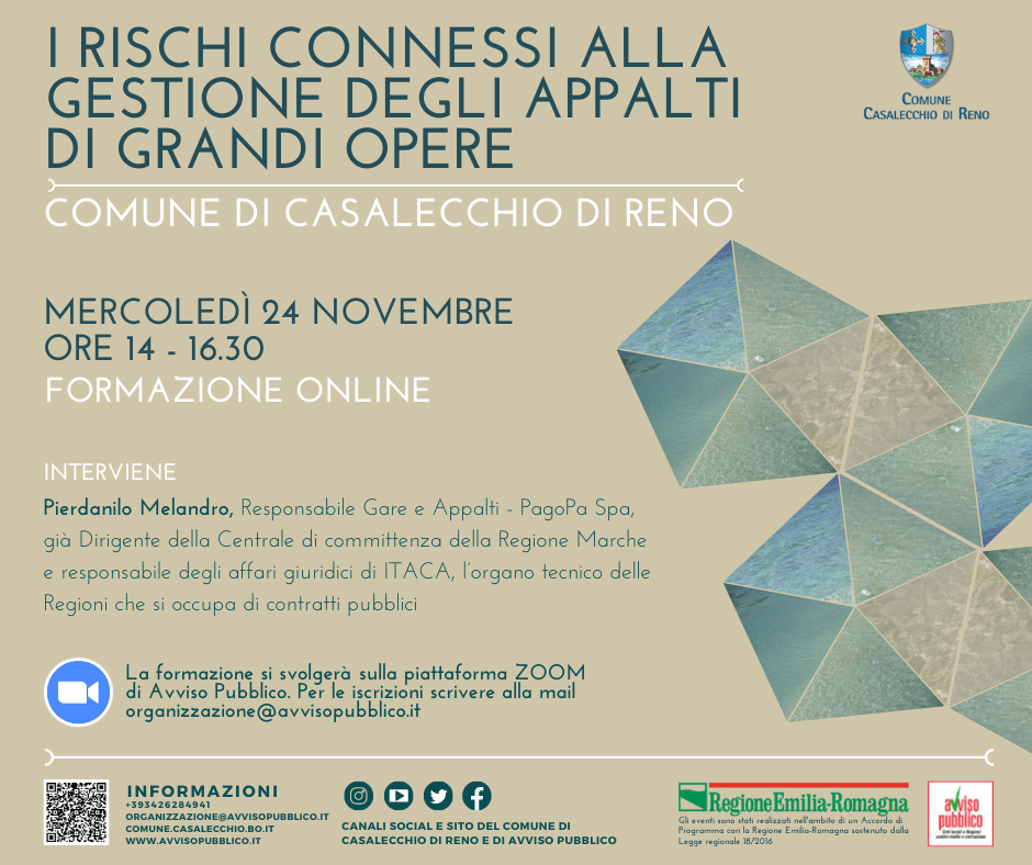 Questa volta Avviso Pubblico e il Comune di Casalecchio di Reno ci accompagneranno dentro le dinamiche e i rischi della gestione dei grandi appalti, nell’ambito del ciclo formativo “Casalecchio di Reno: tra legalità e trasparenza sulle Grandi Opere”, finalizzato a esplorare le dinamiche criminali-mafiose e corruttive che spesso si nascondono dietro la realizzazione delle grandi opere, ma anche a fornire gli strumenti di giusta trasparenza utili a ridurre i rischi di infiltrazione illegale.