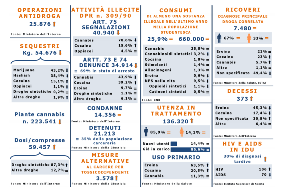 “Il quadro che si delinea attraverso la lettura trasversale delle informazioni raccolte, presenta un andamento molto simile a quello rilevato negli ultimi anni, anche se alcuni aspetti meritano un’adeguata sottolineatura – si legge nella Relazione – Un cenno di particolare rilievo va dedicato all’incremento generalizzato dei danni alla salute direttamente rilevabili: anche quest’anno sono aumentate le overdosi e i ricoveri correlati all’uso di sostanze. Continuano a crescere anche le diagnosi tardive per l’AIDS, dato, questo, che evidenzia un importante campanello d’allarme. Continua a crescere inoltre il mercato della cocaina, con ingenti quantitativi sequestrati, indice di elevata disponibilità della sostanza sul territorio. Dato confermato anche da una maggiore incidenza nei ricoveri e nei decessi. La diffusione delle Nuove Sostanze Psicoattive prosegue la sua espansione, confermando una trasformazione verso mercati complessi e mutevoli. Si consolida la diffusione di modalità di consumo che virano verso le sostanze sintetiche e il poliutilizzo, insieme a forme di consumo più tradizionali ma comunque caratterizzate da modalità occasionali che cambiano secondo i contesti”.