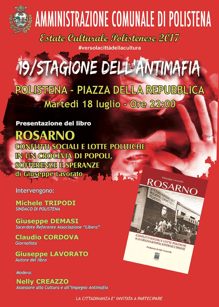 Si svolgerà il 18 luglio a Polistena (RC), a partire dalle ore 22.00 presso piazza della Repubblica, la presentazione del libro Rosarno, conflitti sociali e lotte politiche in un crocevia di popoli, sofferenze e speranze di Giuseppe Lavorato. L’evento si inserisce nell’ambito della rassegna “Estate Culturale Polistena”, organizzata dall’amministrazione comunale.