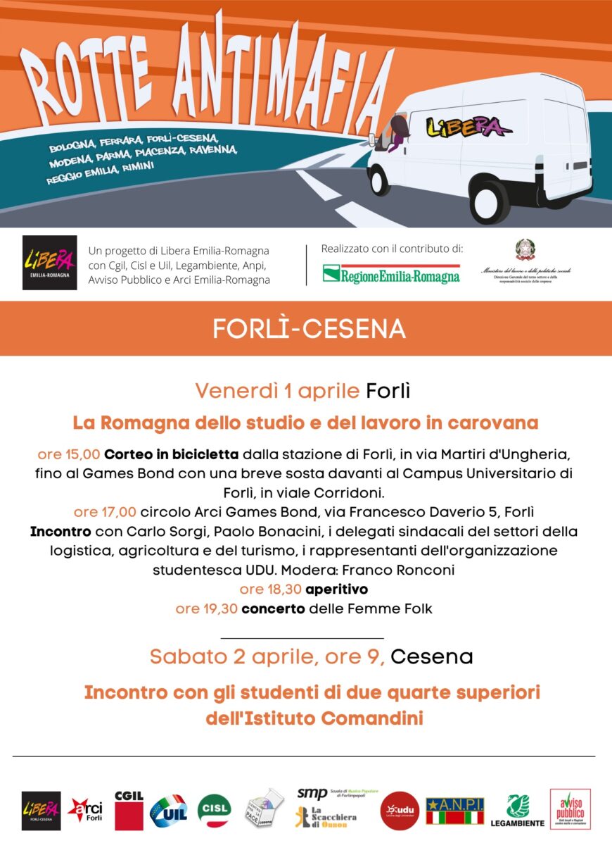 Prosegue il suo viaggio la carovana #RotteAntimafia con la tappa “La Romagna dello studio e del lavoro in carovana”. Un’iniziativa di Libera Emilia-Romagna, con Avviso Pubblico, Cgil, Cisl e Uil, Legambiente, Anpi e Arci Emilia-Romagna, realizzato con il contributo della Regione Emilia-Romagna. È la volta di Forlì e Cesena.