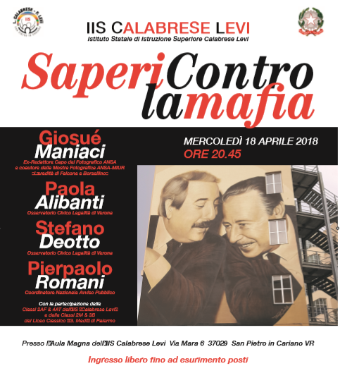 Mercoledì 18 aprile, alle ore 20,45, a San Pietro in Cariano (VR), presso l’Istituto Statale ‘L. Calabrese – P. Levi’, si svolgerà l’evento dal titolo “Saperi contro la mafia”.