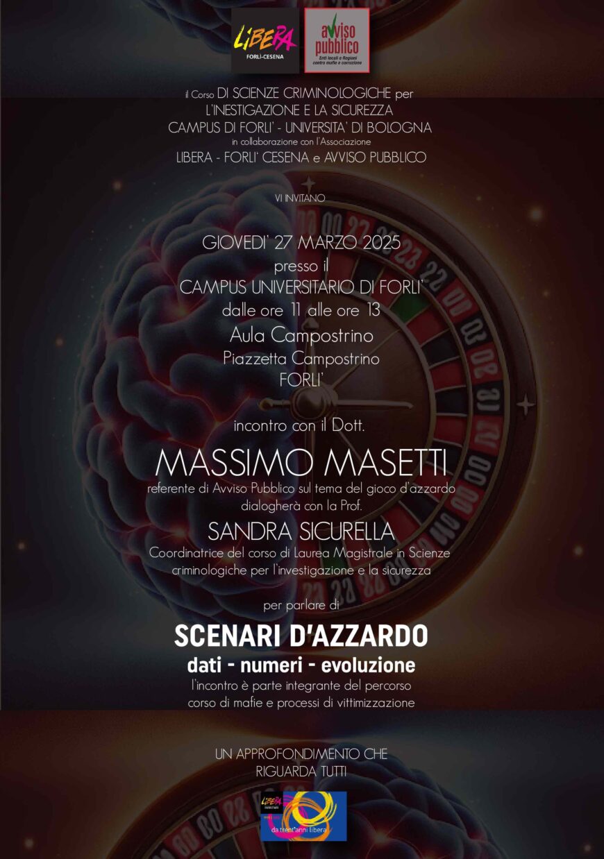 Nell’ambito del Corso di Scienze criminologiche per l’investigazione e la sicurezza, presso il Campus universitario di Forlì – Università di Bologna, si svolgerà l’incontro dal titolo “Scenari d’azzardo: dati, numeri, evoluzione”.