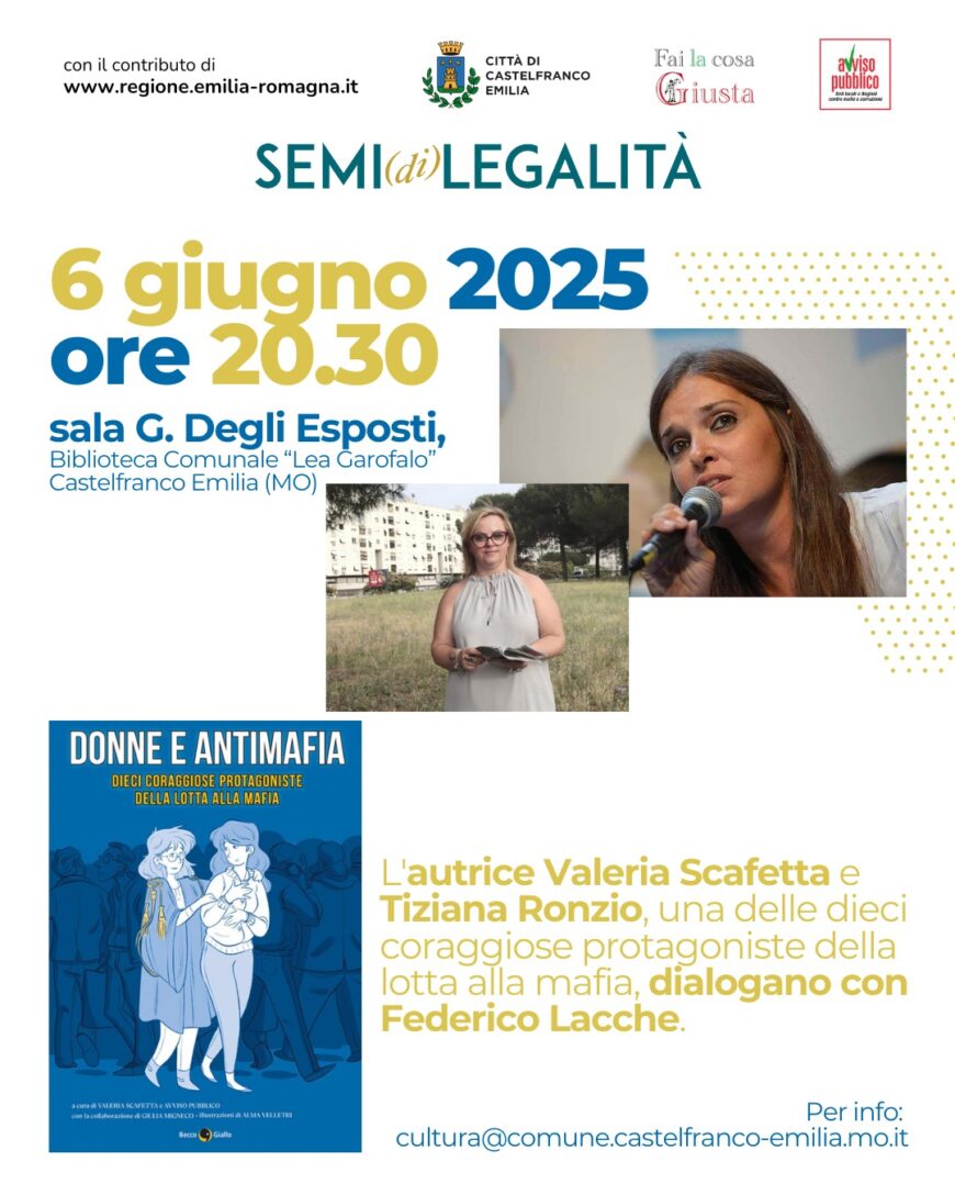 Venerdì 6 giugno a Castelfranco Emilia si parlerà di “Donne e Antimafia – Dieci coraggiose protagoniste della lotta alla mafia”, la graphic novel promossa da Avviso Pubblico, curata da Giulia Migneco e Valeria Scafetta per Beccogiallo editore, in due diversi incontri.
