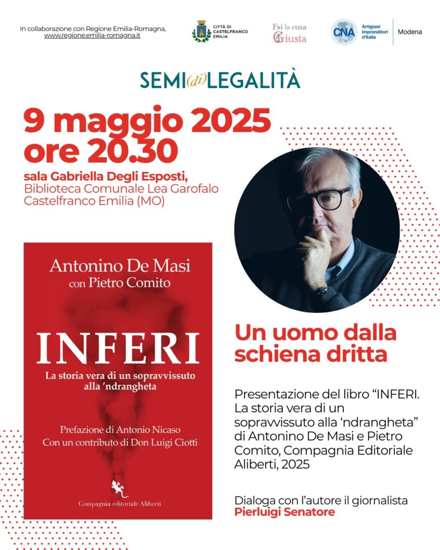 Nell’ambito della rassegna “Semi di legalità”, il Comune di Castelfranco Emilia ospita la presentazione del libro “Inferi – La storia vera di un sopravvissuto alla ‘ndrangheta”, di Antonino De Masi e Pietro Comito (Compagnia Editoriale Aliberti, 2025).