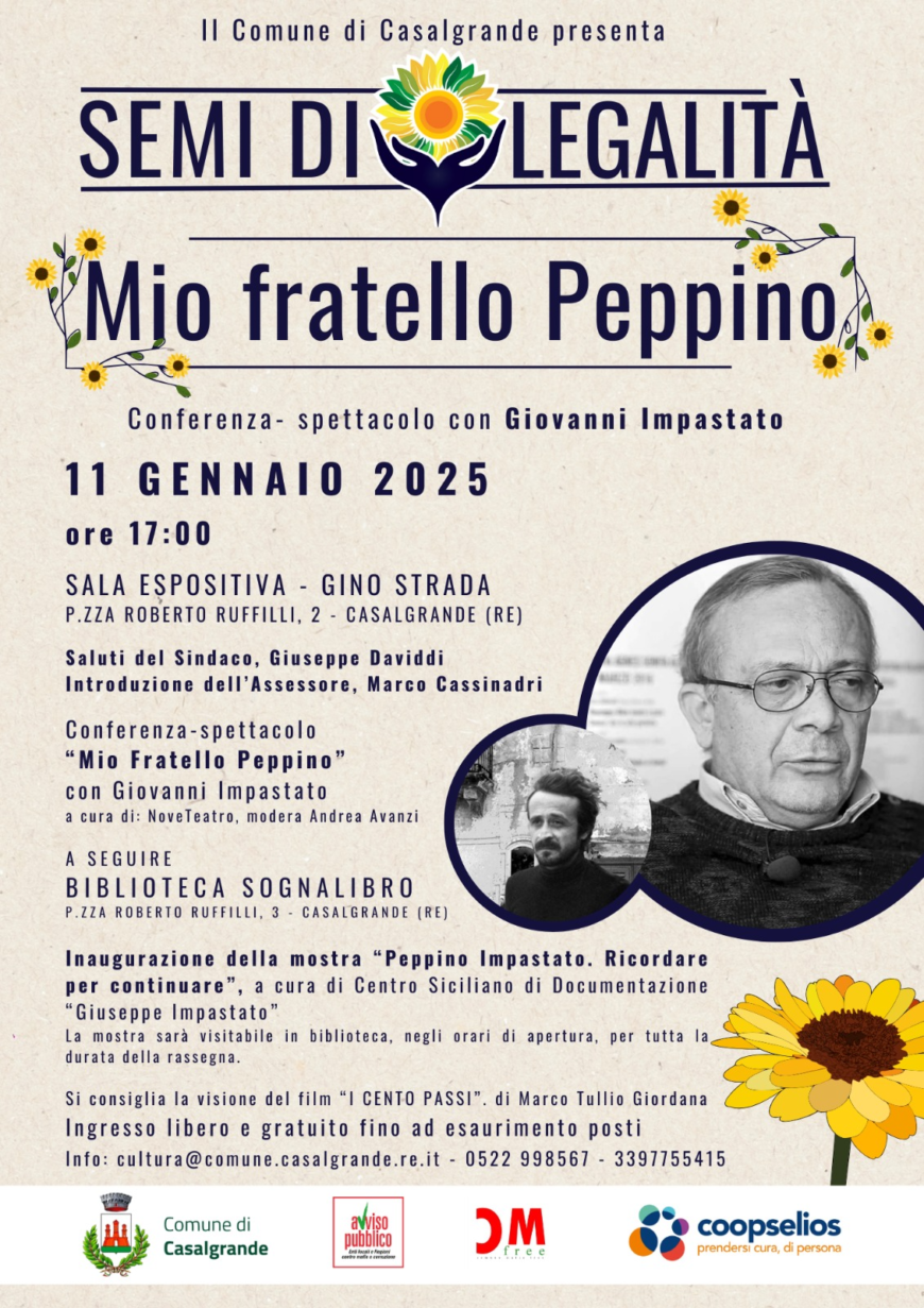“Mio Fratello Peppino”, in collaborazione con Noveteatro, è una conferenza-spettacolo in cui sarà protagonista Giovanni Impastato, fratello di Giuseppe, giornalista ucciso dalla mafia nel 1978.