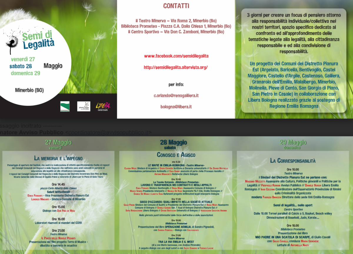 Si svolgerà a Minerbio (Bologna), da venerdì 27 a domenica 29 maggio, la rassegna “Semi di Legalità”, una tre giorni che ha l’obiettivo di creare un focus di pensiero attorno alla responsabilità individuale e collettiva nei territori, uno spazio dedicato all’approfondimento delle tematiche legate alla legalità.