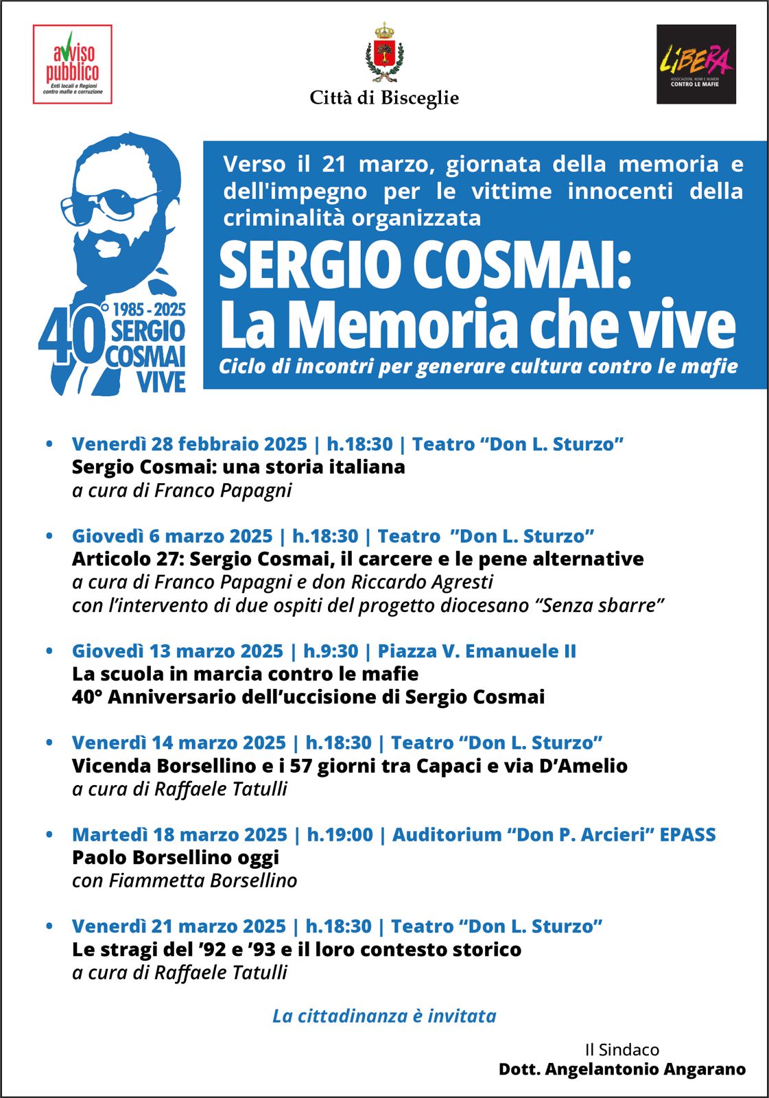 Il Comune di Bisceglie lancia una serie di iniziative nel 40° anniversario dell’assassinio di Sergio Cosmai, cittadino di Bisceglie, vittima innocente di mafia, ucciso dalla ‘ndrangheta a Cosenza il 13 marzo 1985.