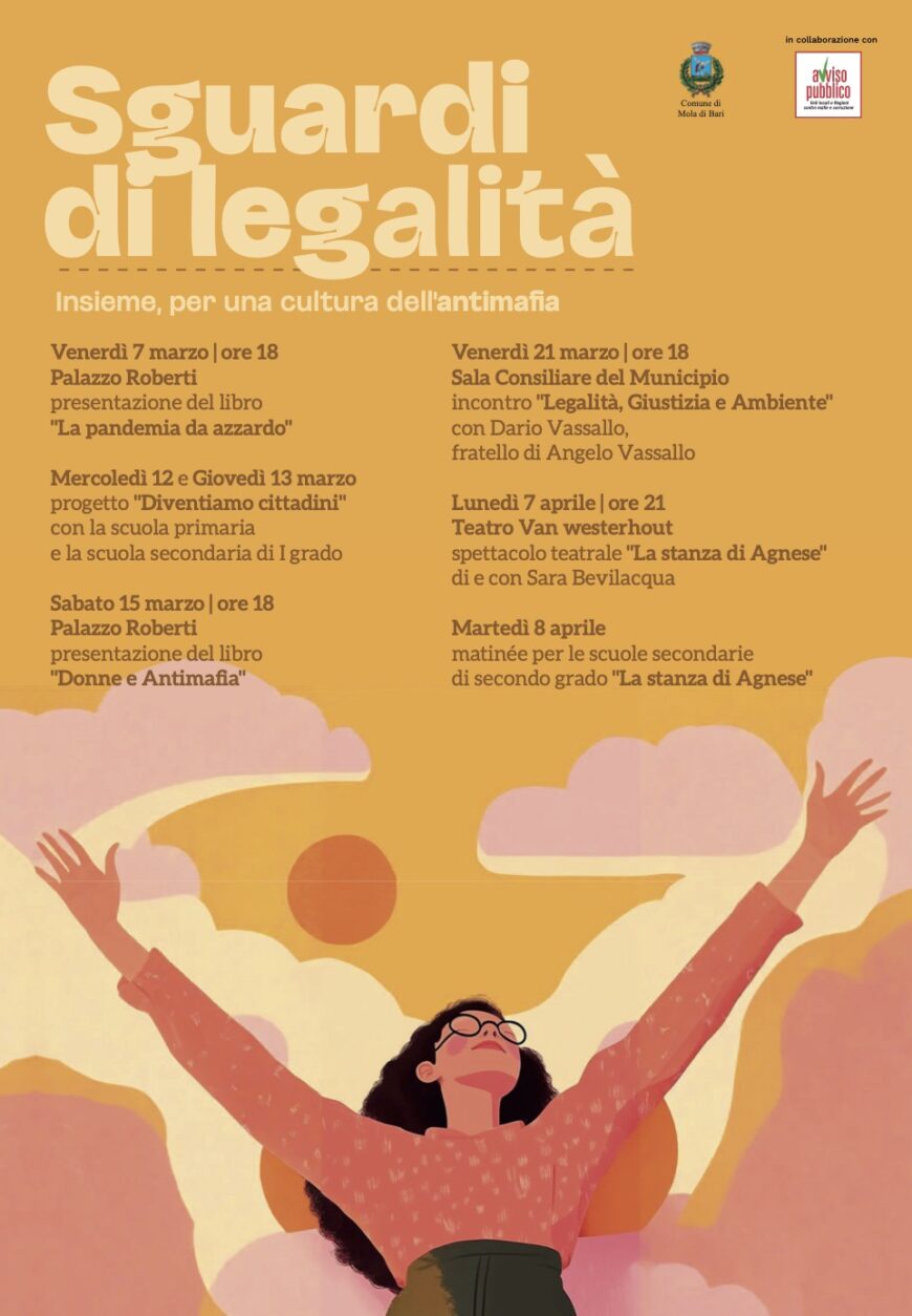 Prenderà il via il 7 marzo la rassegna culturale sulla legalità ideata dal Comune di Mola di Bari in collaborazione con Avviso Pubblico, che coinvolgerà autori, drammaturghi, esperti che fino all’8 aprile proporranno punti d’osservazione privilegiati sul ruolo e l’importanza della diffusione della cultura della cittadinanza attiva e responsabile e dell’antimafia sociale. Da venerdì 7 marzo a martedì 8 aprile sei appuntamenti tra presentazioni di libri, incontri con le scuole, spettacoli teatrali e la visita di Dario Vassallo, fratello di Angelo Vassallo, il sindaco pescatore.