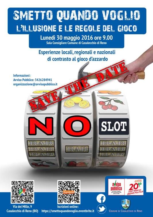 Si svolgerà il 30 maggio, a partire dalle ore 9.00 presso la Sala Consiliare del Comune di Casalecchio di Reno (Bologna), ente socio di Avviso Pubblico, il convegno “Smetto Quando Voglio. Esperienze locali, regionali e nazionali di contrasto al gioco d’azzardo“, organizzato da Avviso Pubblico e dal Comune di Casalecchio di Reno.