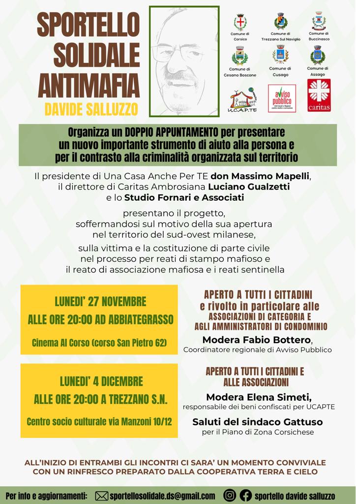 Nel Sud ovest Milanese lo scorso aprile è stato aperto uno sportello dedicato alle vittime di racket, usura e reati correlati. Questo strumento è nato su iniziativa dei Comuni di Assago, Buccinasco, Cesano Boscone, Corsico, Cusago e Trezzano sul Naviglio nell’ambito del Piano di Zona, in collaborazione con l’associazione Una Casa Anche Per TE, Città metropolitana di Milano e Avviso Pubblico.