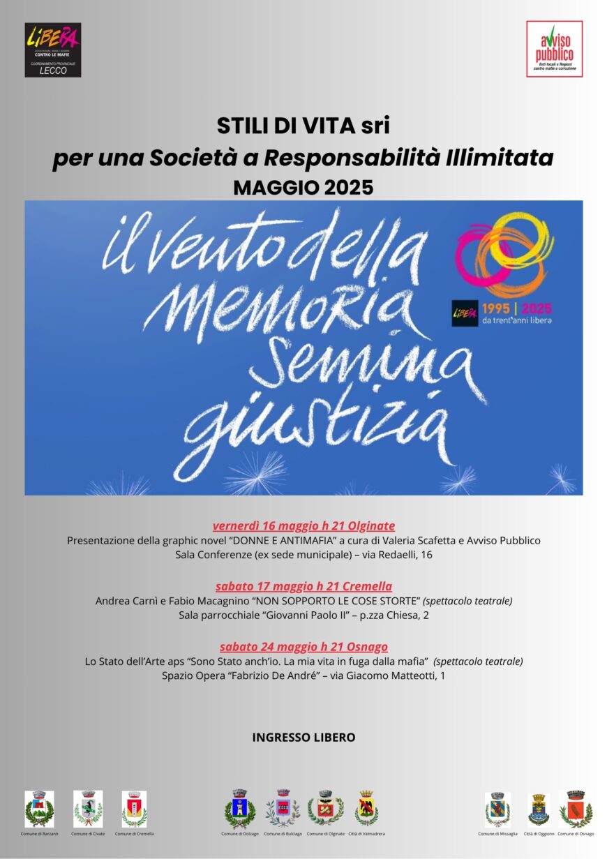 Prosegue con altri tre incontri la rassegna “Stili di vita S.r.i. – per una Società a Responsabilità Illimitata”, ideata e promossa dai Comuni di Barzanò, Civate, Cremella, Dolzago, Bulciago, Olginate, Valmadrera, Missaglia, Oggiono e Osnago.