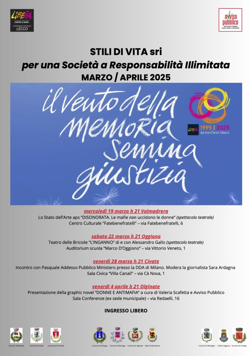 In occasione della 30° Giornata della memoria e dell’impegno in ricordo delle vittime innocenti delle mafie, i Comuni di Barzanò, Civate, Cremella, Dolzago, Bulciago, Olginate, Valmadrera, Missaglia, Oggiono e Osnago, promuovono la rassegna “Stili di vita S.r.i. – per una Società a Responsabilità Illimitata”, di cui i primi incontri si svolgeranno fra il 19 marzo e il 4 aprile.